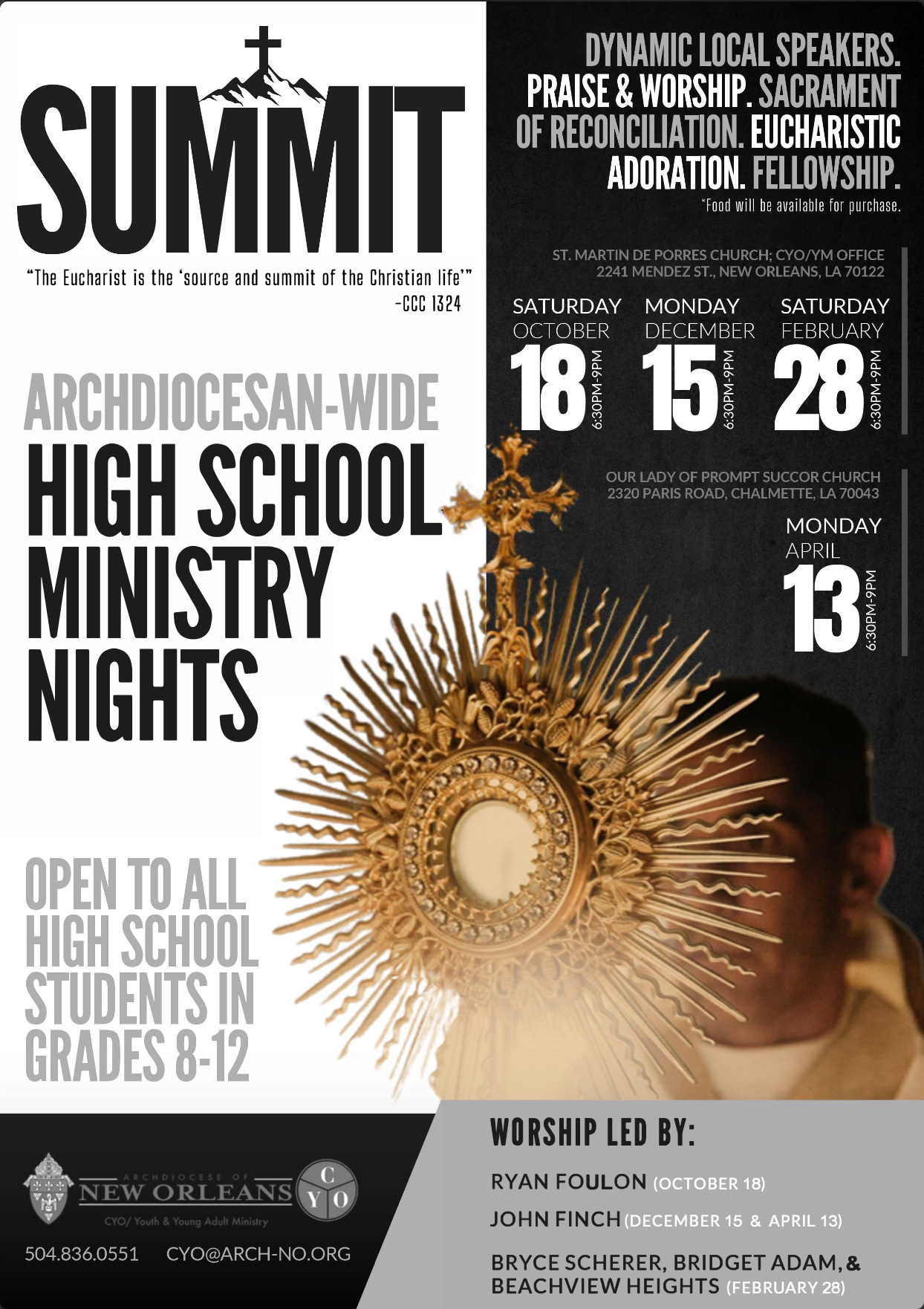 The Archdiocese of New Orleans' brand new program, “Summit: High School Ministry Nights”, kicks off with our first event next Saturday, October 18th from 6:30pm to 9:00pm at St. Martin de Porres Church (parking located at 2241 Mendez Street New Orleans, LA 70122)! The night will begin with praise & worship in the Church, led by Ryan Foulon, and feature keynote speaker Alanna Thibodeaux. We will also have Eucharistic Adoration, with confessions available, followed by fellowship in Youth & Young Adult Ministry Office gym (across the parking lot from the Church). Food will be available for purchase!